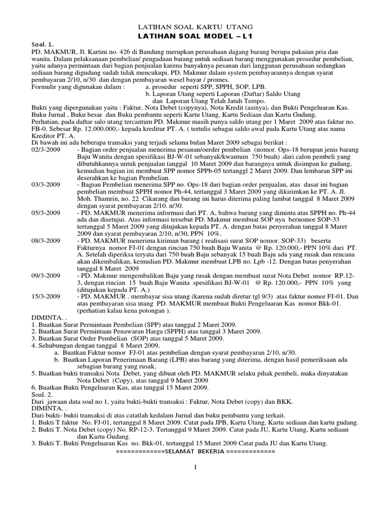 Soal praktek ukk 2019 pt sejahtera abdrahwordpresscom. Contoh soal kartu utang dan jawabannya berbagi contoh soal posted on march 29 2021 by contohkumpulan 12 contoh transaksi. Utang adalah kewajiban membayar suatu badan/perusahaan kepada pihak lain yang disebabkan adanya transaksi pembelian barang atau jasa secara kredit. Lina mengutip pendapat pada sebuah buku. Selamat datang dan selamat menemukan artikel yang anda cari.