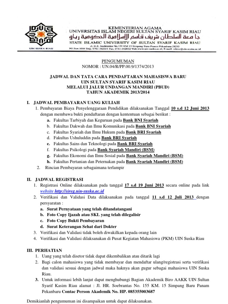 Campus relation manager pt rapp ajak lulusan perguruan tinggi yang berkompeten dan berdaya saing. Ketentuan dan tata cara pembayaran ukt bagi mahasiswa baru jalur cat/tulis mandiri uin suska riau ta 2021/2022 Jalur ujian tulis bisa jadi alternatif buat kamu yang tidak lulus seleksi jalur sebelumnya. Sementara, kuota yang diterima dalam proses pendaftaran mandiri tahun ini sebanyak 7.601 untuk prodi saintek dan 6.889 untuk prodi soshum. Untuk membantu quipperian memilih jurusan, berikut ini daftar passing grade uin suska riau pada 2016 yang bisa kamu jadikan acuan: