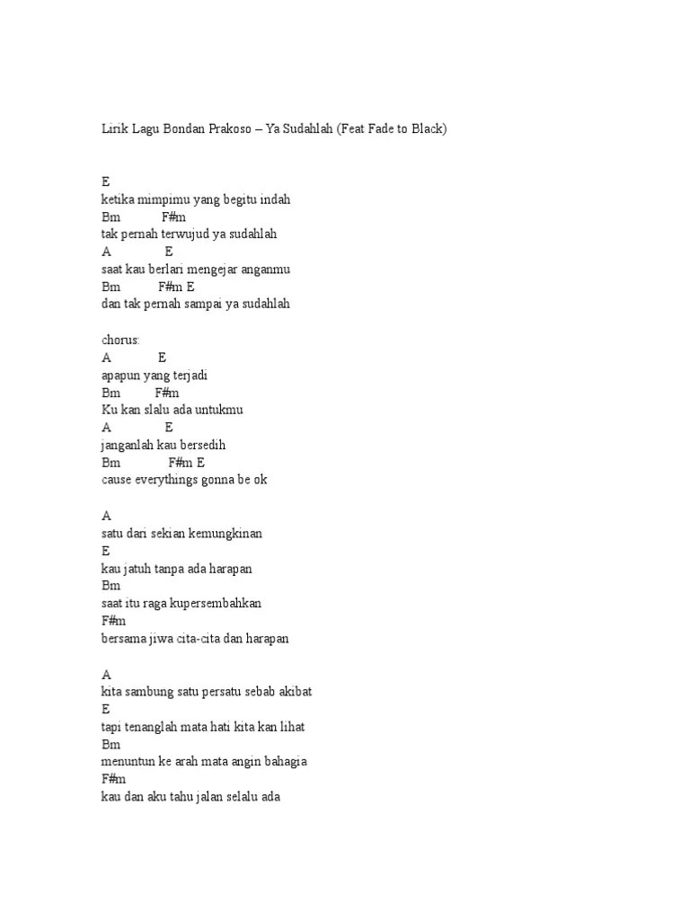 Layanan mobile dari situs entertainment terbesar indonesia, kapanlagi.com. Ditambah penggalan lirik bahasa inggris yang bisa buat ajang . Ketika mimpimu yang begitu indah., itulah cuplikan liriknya. Saat kau berlari mengejar anganmu Ketika mimpimu tak begitu indah. 'ya sudahlah' merupakan lagu yang dinyanyikan oleh bondan prakoso dan fade 2 black. Bondan prakoso* ketika mimpimu yang begitu indah, tak pernah terwujud. Tak pernah terwujud., ya sudahlah. Lagu ini diambil dari album for all yand dirilis tahun . Isi dari artikel ini menunjukan bahwa makna persahabatan lirik lagu "ya sudahlah" karya bondan prakoso & fade2black memiliki makna memiliki makna . Inilah lirik lagu ya sudahlah yang dipopulerkan oleh bondan prakoso. Fade 2black berjudul ya sudahlah menjadi ramai di tiktok, begini lirik lengkapnya. Bm f#m tak pernah terwujud ya sudahlah